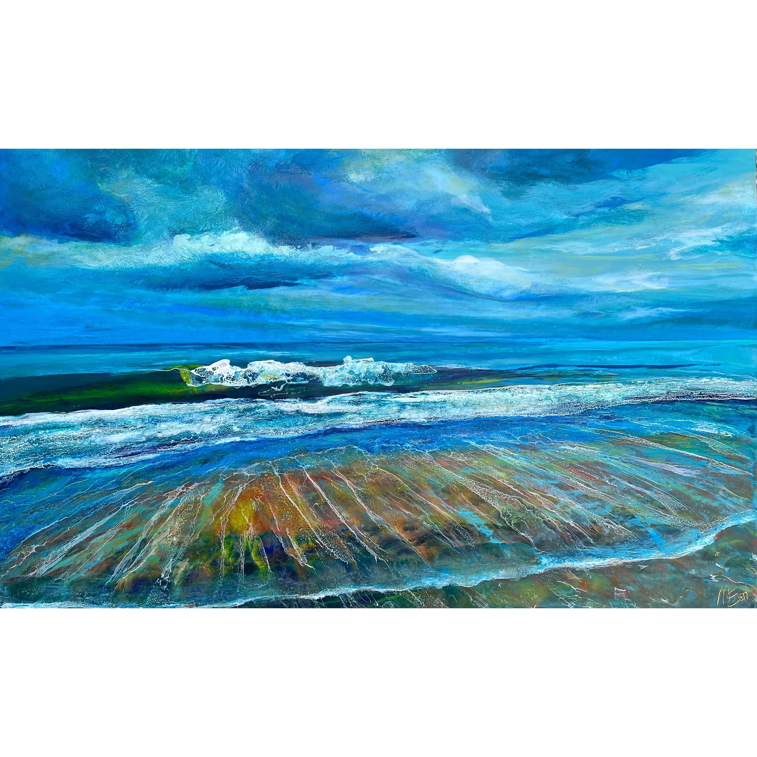 The perpetual movement of water is hypnotic and soothing. Whether it is a trickling stream or waves washing onto ocean shores, I am captivated and mesmerized by it. With Encaustics each layer must be melted before the next is added. That melting river of wax allows translucent sheets of the colours to peek through. On so many levels the Encaustic medium is meant to portray the fluidity of water!